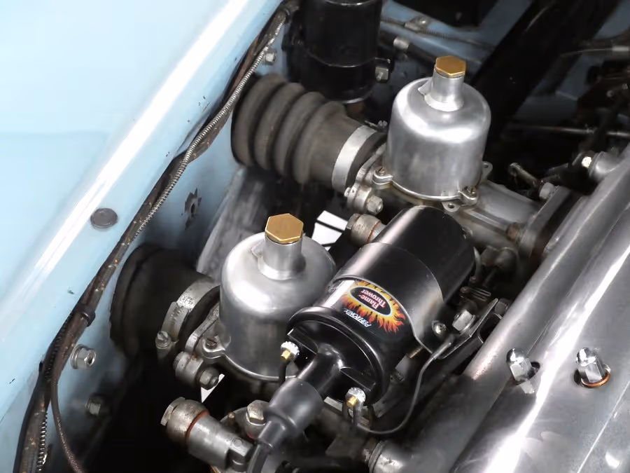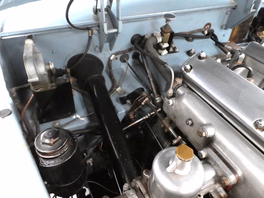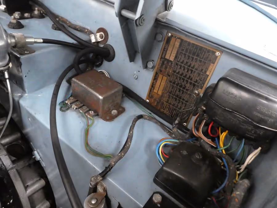The engine bay is exactly as you would wish to see, adorned with period service stickers, beautifully detailed H6 carbs, an original Lucas B12/L ignition coil, still working perfectly, as are both the Lucas C.45/PVS/S Special Equipment Dynamo and Lucas C.2530 Control Box.