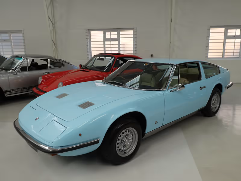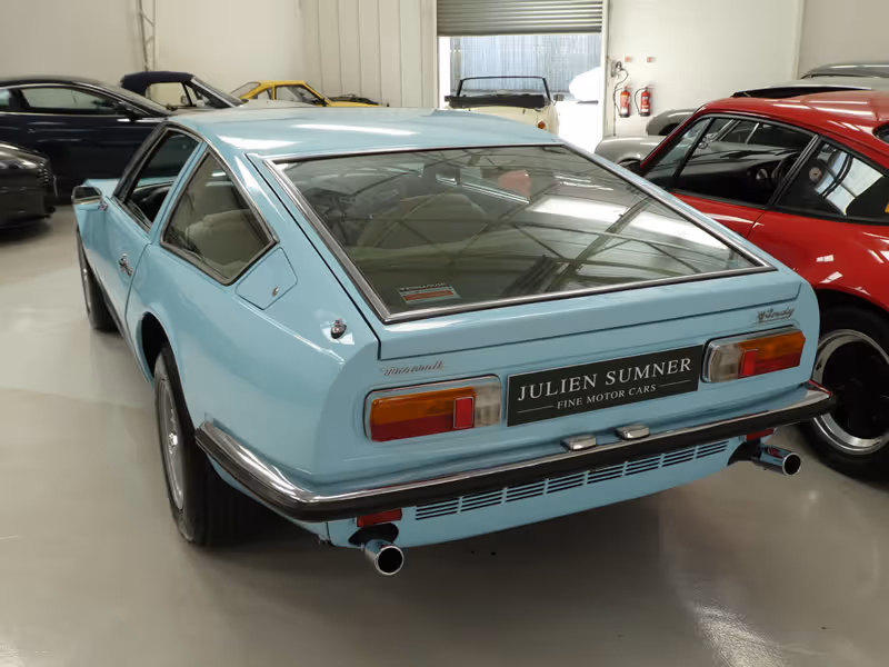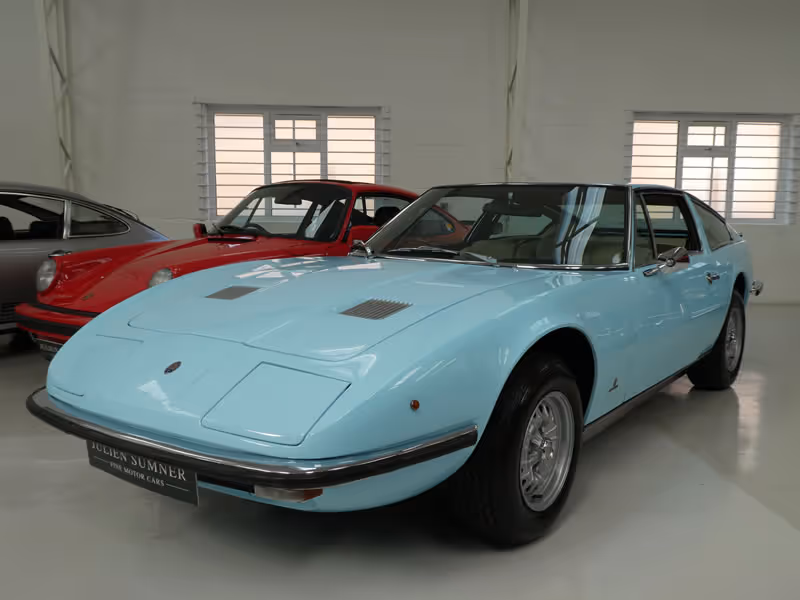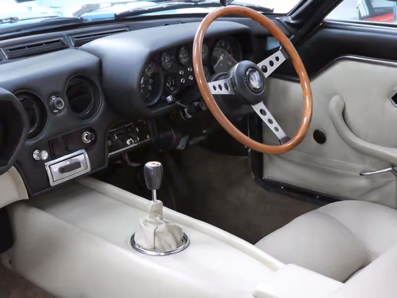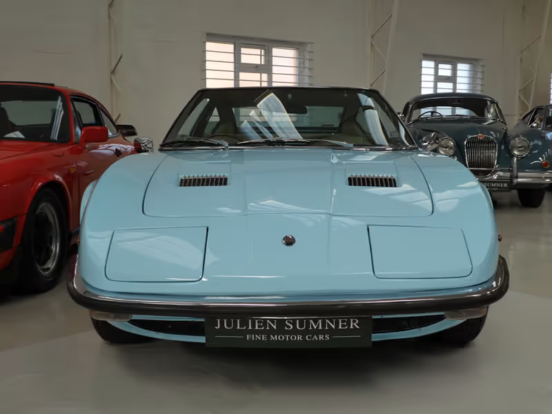 Both the Maserati Classiche Department in Modena and Maserati's UK Owners Club confirm that this car was dispatched from the factory on 21st June 1970 as a manual INDY 4200 finished in Azzurro Hyperion (Light Blue) with white leather and delivered to Mr Franco Maletti in Modena....pleasingly the Indy remains matching.
