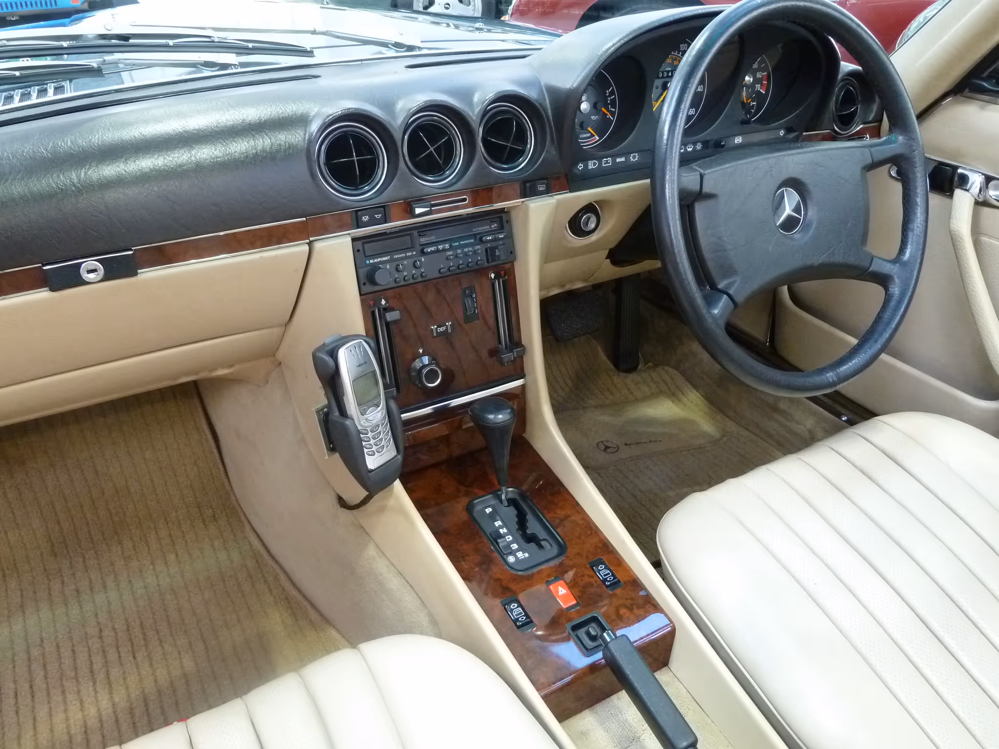 Both the navy blue soft top and detachable hard top are in immaculate order; the unmarked interior is a wonderfully place to sit and as you would expect everything works perfectly. Original manuals and service booklet are all present together with tools and a factory wrapped first aid box....there's even a working period Nokia and hand free kit in situ!