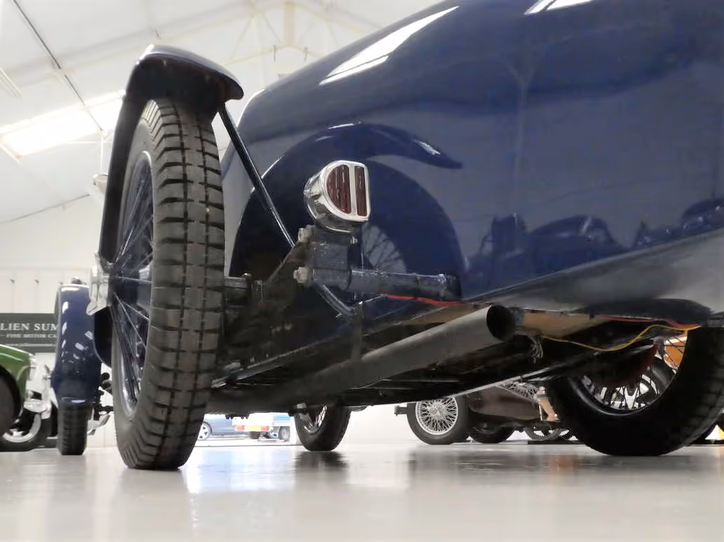 Since being repatriated to England the car has undergone a comprehensive rebuild. The chassis was stripped blasted, primed and painted and new bushes and bearings fitted wherever necessary. Bodywork has been attended to by coachwork specialist Ian Pitney with a new ash frame and remodelled tail not forgetting the correct cycle wings. To finish the look, an attractive and effective external Brooklands style exhaust was designed and fitted by Dave Tyler.