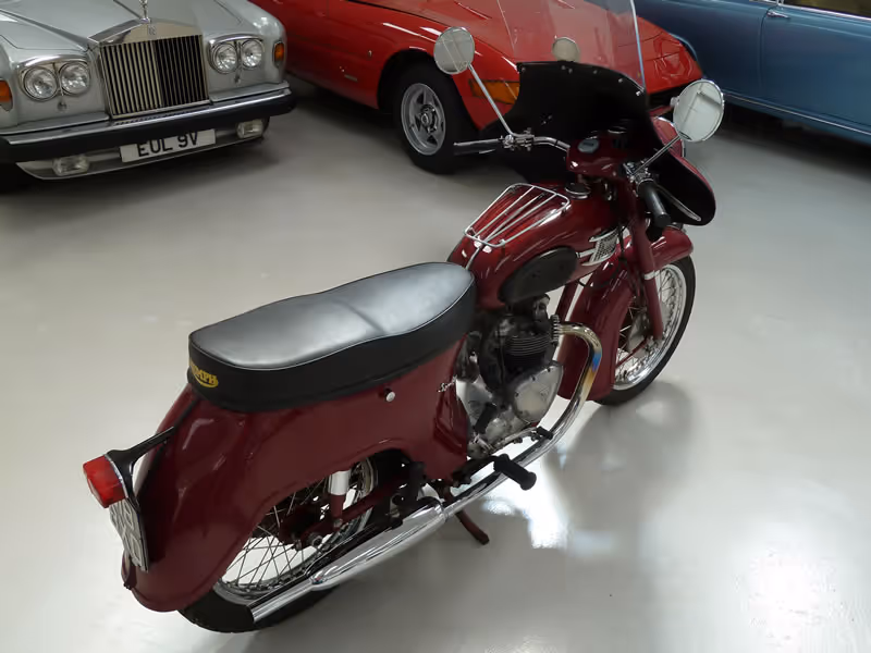 This very handsome example is finished in its correct Amaranth Red and has its all metal Bathtub intact plus the front fairing, which can if desired be easily removed. This easy starting and sweet running Triumph is in lovely order, plus pleasingly has matching numbers and an original transferable registration number. Recently serviced and motd until December 2018.